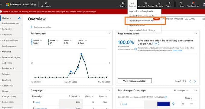Pinterest Imports. Microsoft’s Import tools allow advertisers to import campaigns from Google and Facebook into Microsoft, for easier setup and quicker launch. Now, advertisers can import campaigns from Pinterest as well. Changes to bids, budgets, and other campaign settings are available.